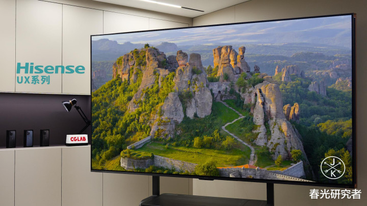 除了画质方面,我们还发现海信把全新一代的黑曜屏Ultra也给了UX系列,拥有1.28%的行业超低反射率,和178°的超广视角,我们之前在测试E8Q Pro的时候也体验过。从侧面实拍来看,RGB-Mini LED完全可以和天生广视角的OLED抗衡。