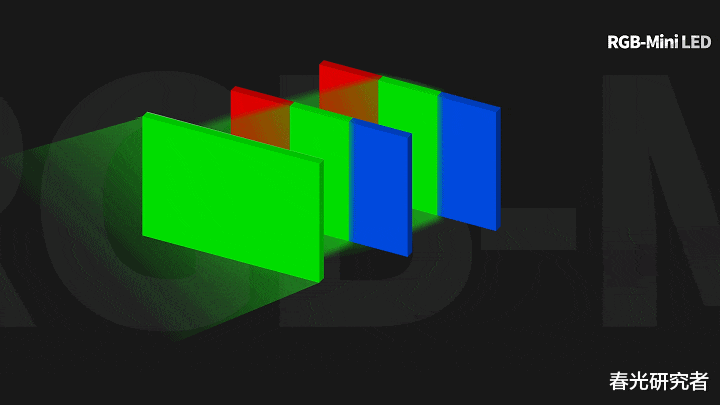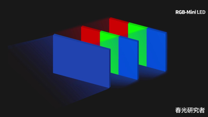这个时候就有「大聪明」会说了,直接把单色背光换成三色的,蓝光去穿透蓝色膜片,红光去穿透红色膜片,绿光去穿透绿色膜片。恭喜你,发明了RGB-Mini LED,为电视行业的发展启发了全新的道路。