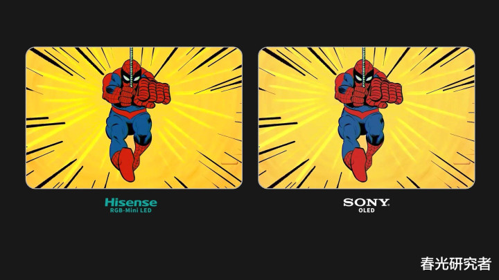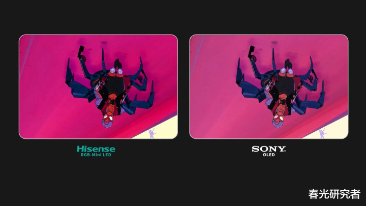 尤其是像《蜘蛛侠:纵横宇宙》这种高饱和度、色彩丰富、大面积色块的影片,RGB-Mini LED的效果要比OLED更好。