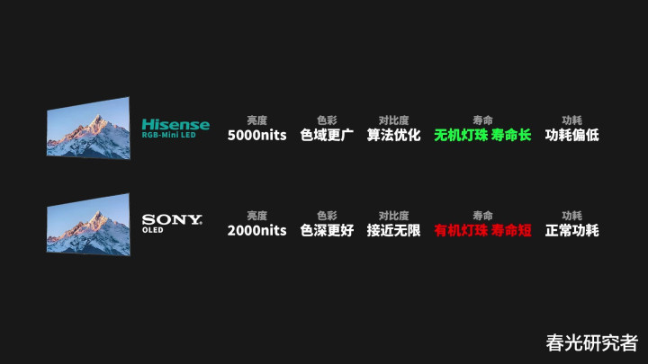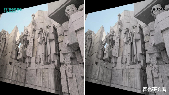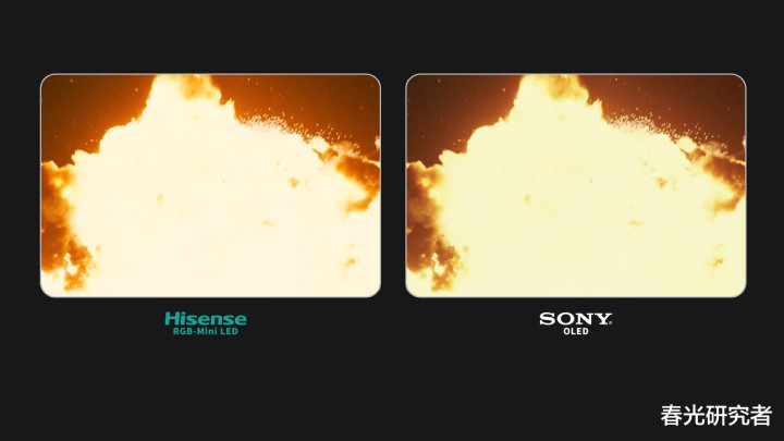 总结一下,我们认为这两台电视在画质方面各有各的优势:亮度方面,RGB-Mini LED是碾压式的胜利。色彩方面,RGB-Mini LED的饱和度更高,色域更广,OLED的色深更优秀。暗场和对比度方面,OLED自带Buff,RGB-Mini LED依靠的是算法去优化,算是五五开吧。