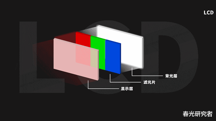 LCD本身不发光,是依靠背光去照亮液晶层,就像是手电筒前面装了彩色卡片,能照出不同的色彩。
