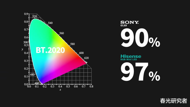 RGB-Mini LED把背光变成三个灯珠之后,就可以直接输出三原色,光效的损耗减小了,而且色彩也会更纯净,尤其是在色域这项参数上,理论上可以直接把OLED踩在脚下。