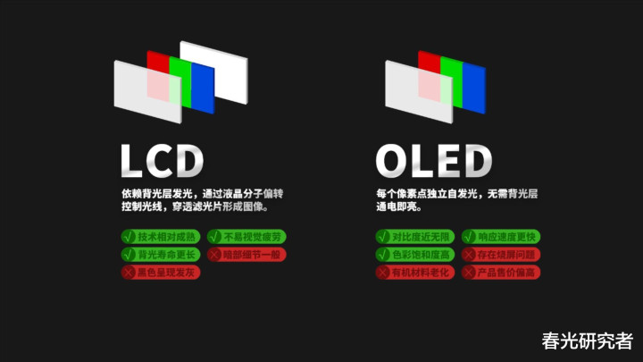在过去很长一段时间里,电视行业都是「等级森严」,入门和中端级是以LCD为主,高端局则是被OLED统治,二者最大的区别是: